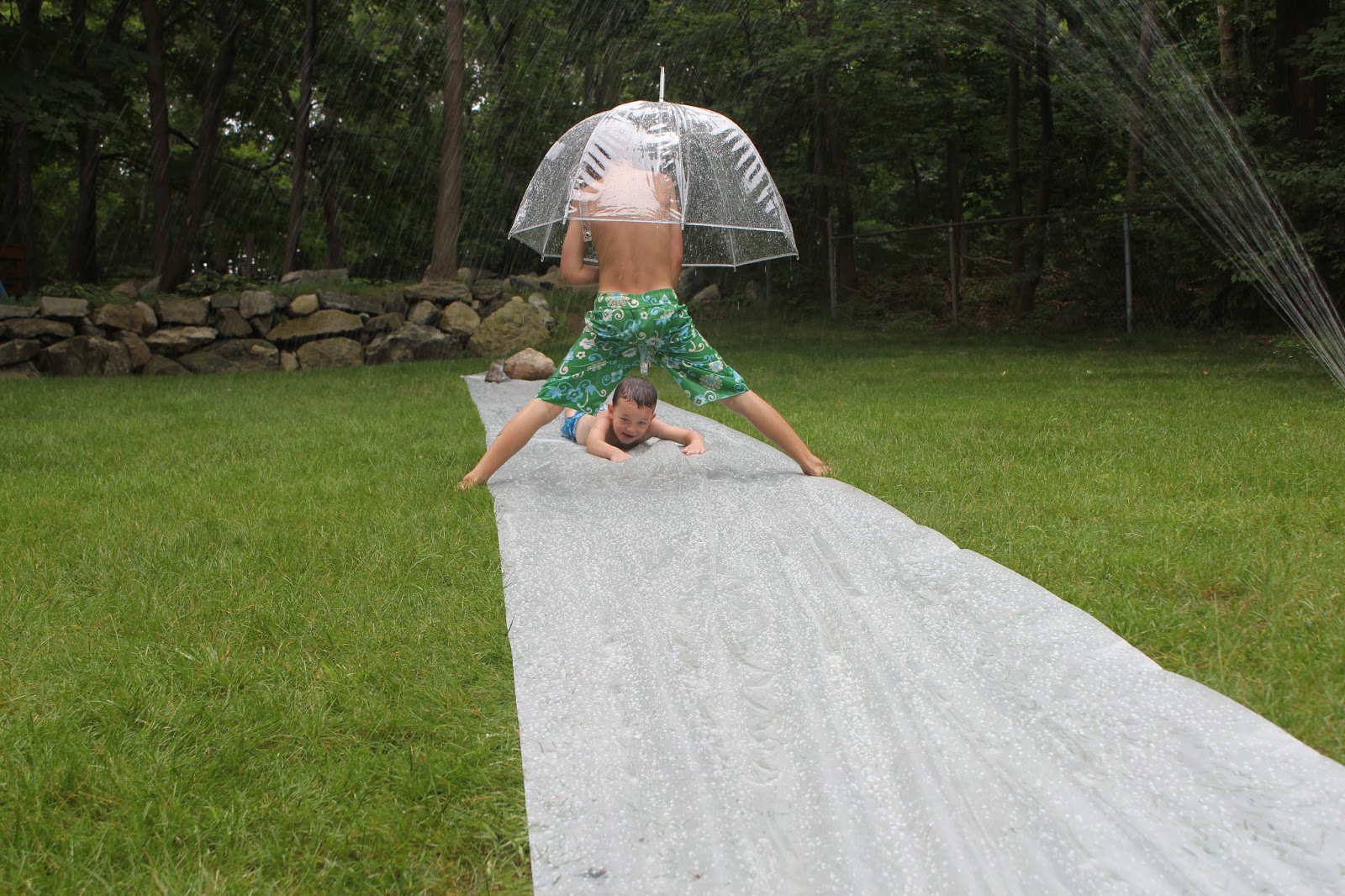 And as they chase the butterfly, they run past the sprinkler, which reminds them it is really fun to let it splash in your face.